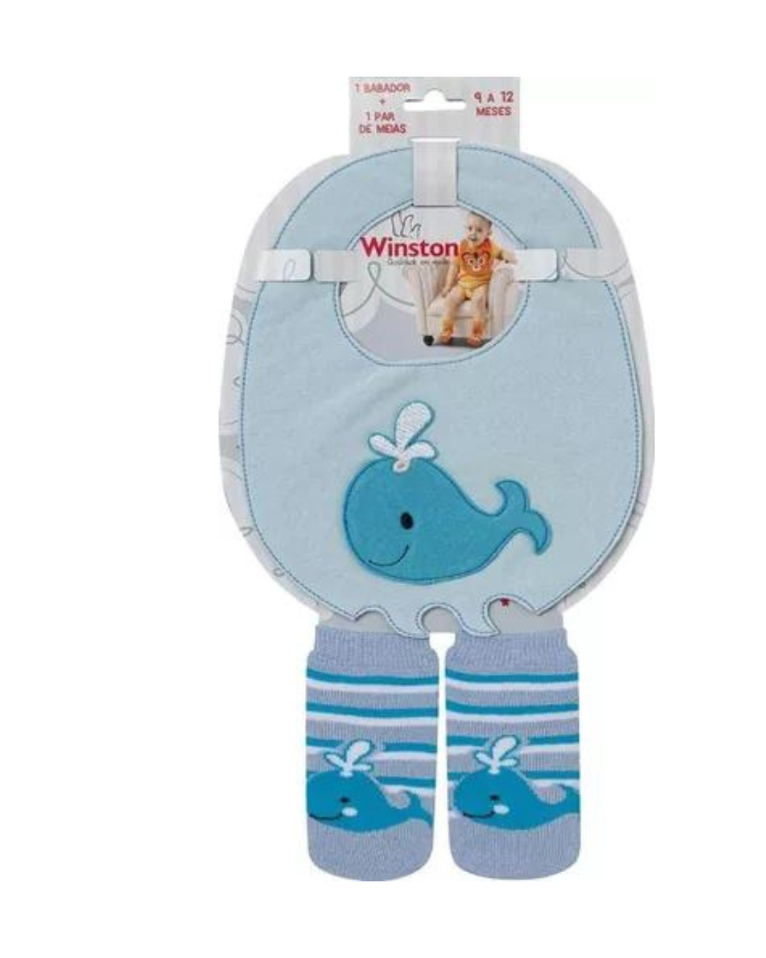 Fechamento por pressão e acabamento em viés, o babador conta com um modelo estampado e o par de meia combinando com a estampa do babador